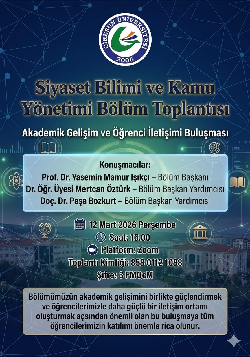 Siyaset Bilimi ve Kamu Yönetimi Bölümü olarak öğrencilerimizle doğrudan iletişim kurmak, görüş ve önerilerini dinlemek ve bölümümüzde yürütülen akademik süreçlere ilişkin bilgilendirme yapmak amacıyla 12 Mart 2026 tarihinde Öğrenci Buluşması düzenlenmiştir.